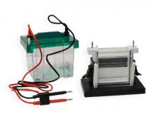 Complete: tank, lid with electrodes, gel support, gel casting device, plane and notched glass plates and set of combs.